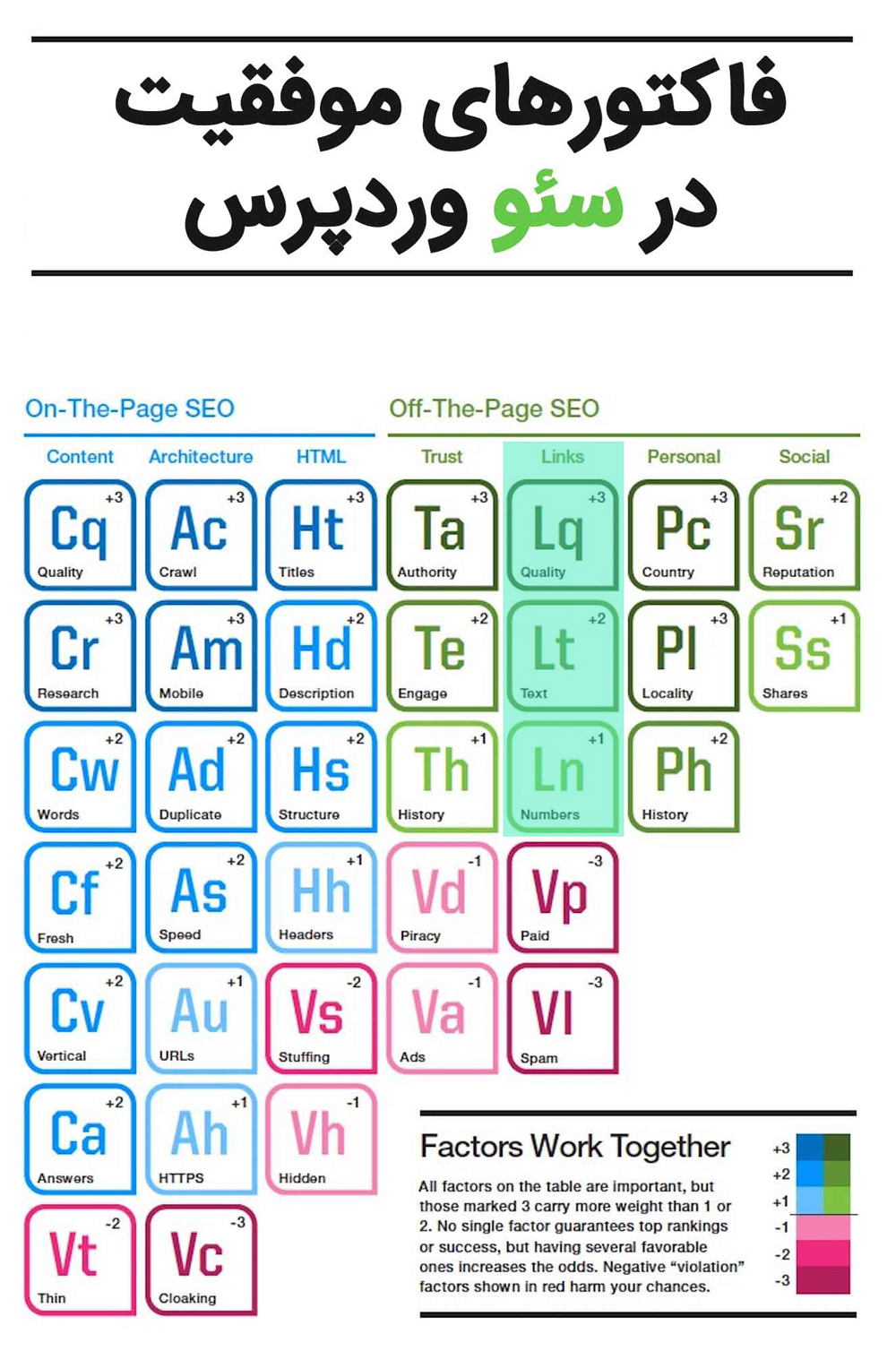 قبل از شروع بررسی، مجدد نگاهی به جدول تناوبی فاکتورهای موفقیت در سئو وردپرس بیندازیم: